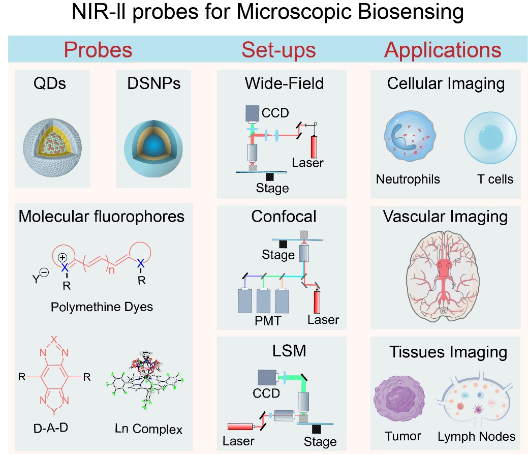 杨震教授团队深入讨论NIR-II区荧光探针与显微镜设备之间的性能权衡后,重点介绍不同基于显微镜设备的NIR-II区荧光成像(NIR-II FLI MS)模式下对荧光探针的特定需求及提升不同NIR-II区探针光学性能的可行策略。系统总结了NIR-II区显微镜成像设备的最新进展,重点阐述宽场、共聚焦和光片显微镜成像系统在高性能活体检测中的操作原理和特定要求。文章进一步详细讨论了这些探针和显微镜成像系统在活体内NIR-II FLI MS中的前沿应用。在此基础上提供了该领域持续挑战和未来发展方向的全面、跨学科分析,旨在完善新型高性能NIR-II区荧光探针和显微镜设备的发展,推动活体内细胞水平的实时动态示踪,并促进活体内NIR-II FLI MS从“技术驱动”向“科学驱动”的转变。