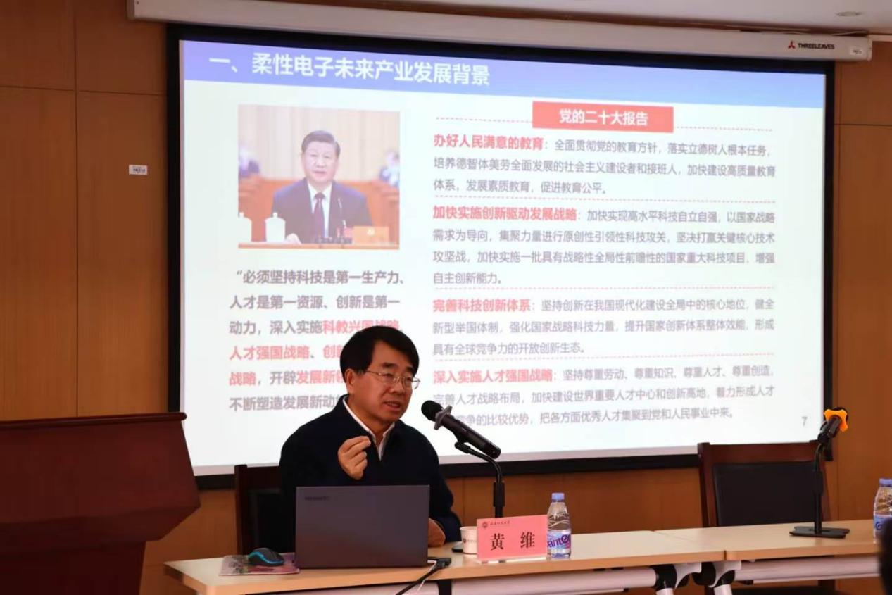 3月22日,中国科学院院士、我院首席科学家黄维教授,以“铸就新质生产力,造柔性电子强国”为主题,为学院研究生讲授思政课。活动由副院长杨震教授主持,学院领导班子成员、硕博研究生代表参加学习活动。