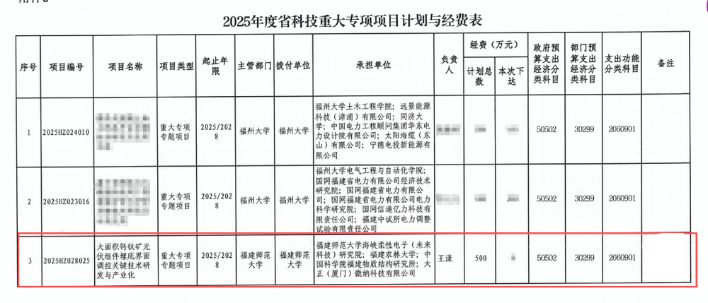 近日,福建省财政厅、科技厅公布2025年度“揭榜挂帅”科技重大专项立项名单,我院王漾教授牵头申报的“大面积钙钛矿光伏组件埋底界面调控关键技术研发与产业化”项目获批立项,资助经费为500万元。这是由我院主持承担的首个省级“揭榜挂帅”科技重大专项项目,标志着我院在服务国家和地方经济发展、推动产学研深度融合方面取得了重要突破。