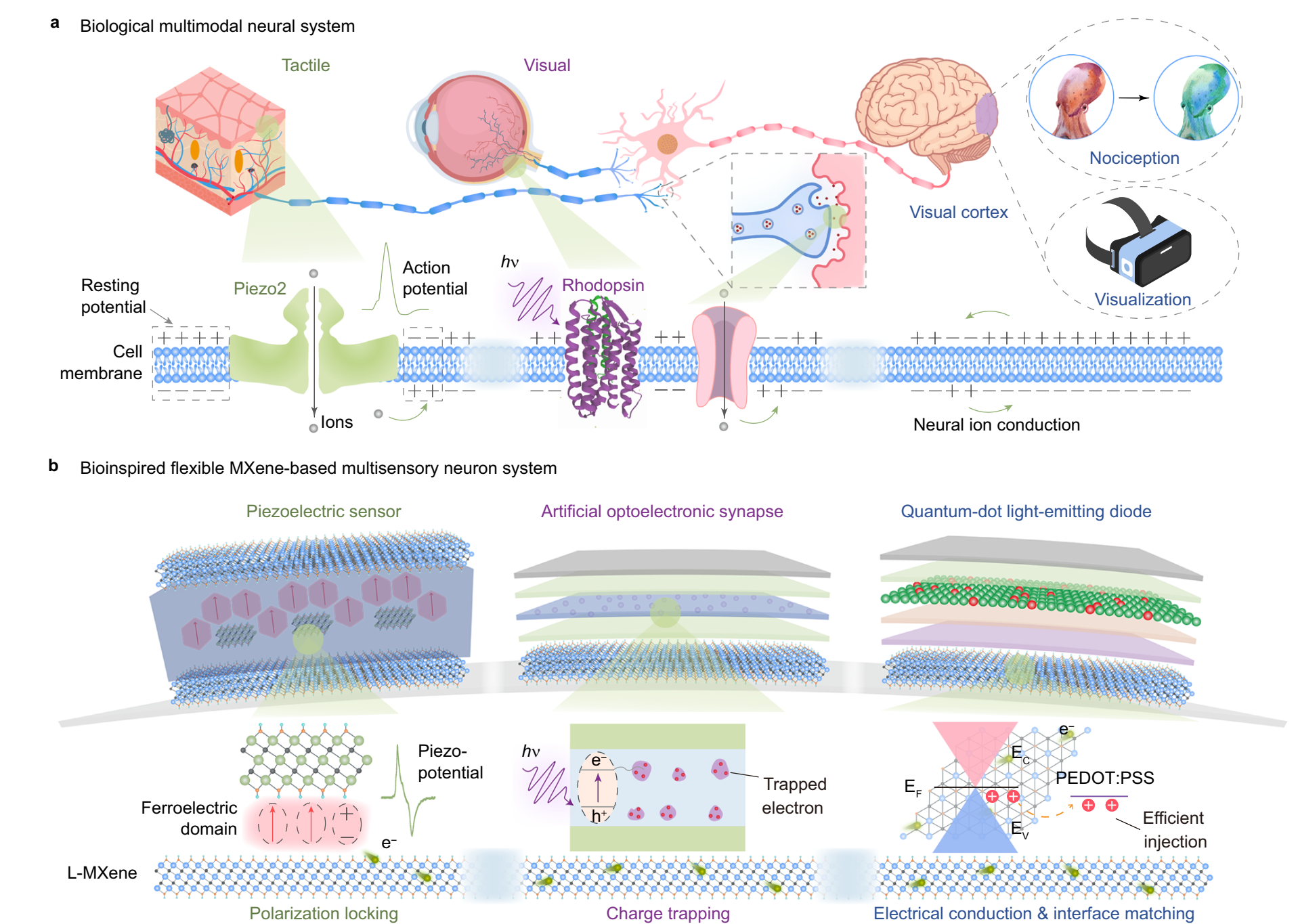 该研究提出的仿生柔性智能系统以2D MXene作为共用界面,通过材料功能化调控,实现了压电纳米发电机(触觉感知)、光电突触器件(视觉感知与光电信息处理)以及量子点发光二极管(光学反馈)之间的无缝集成。实验结果表明,该柔性智能光电系统不仅能够实现触觉—视觉信号的协同识别,还展现出对环境刺激的自适应生物防护行为、动态轨迹识别以及面向运动感知的空间定位等功能特性。该研究为发展新一代可穿戴智能硬件、神经形态边缘计算系统及高效人机交互技术提供了新的研究思路。